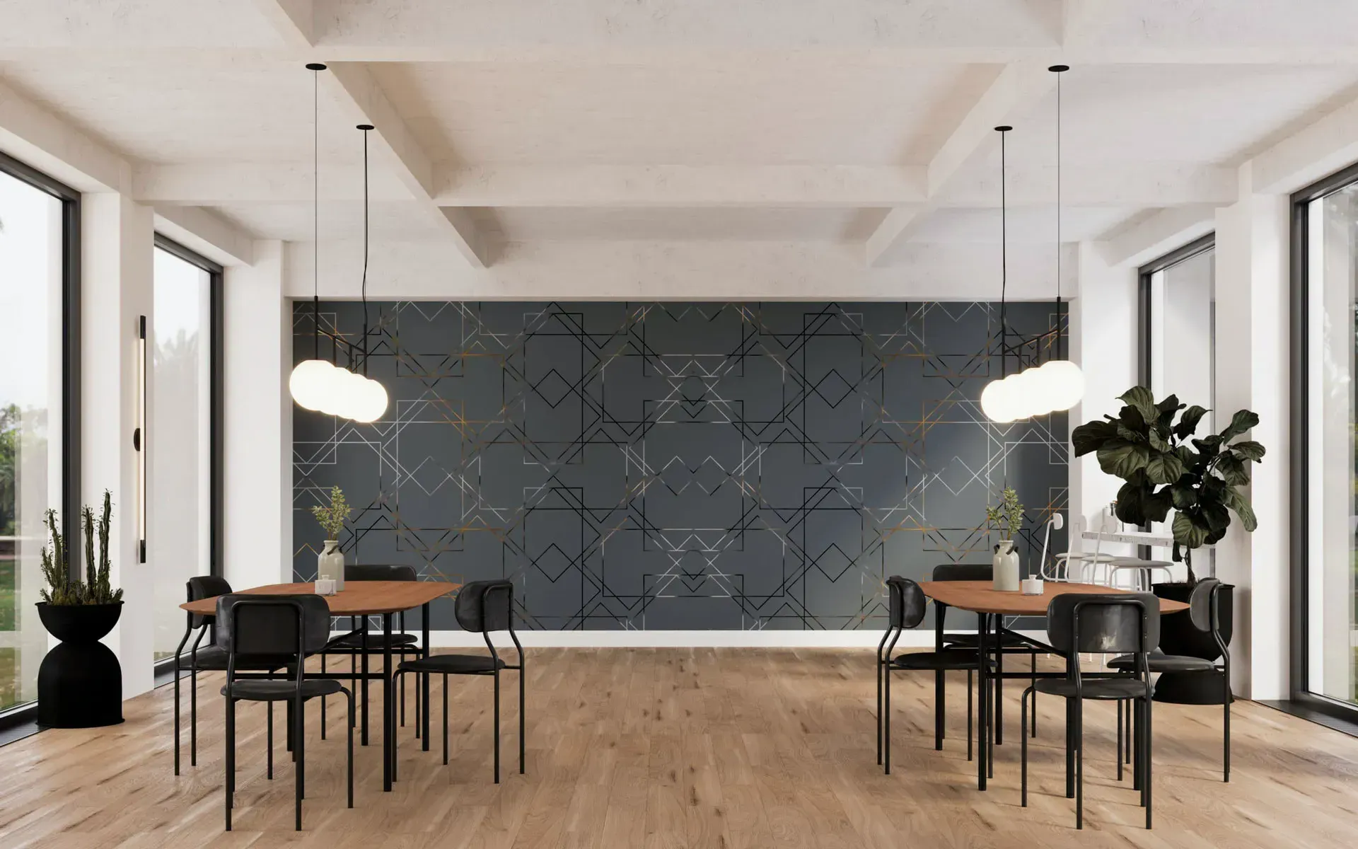 Auf den Punkt bringt das Motiv Pixel in den Farben Denim und Azure Ruhe und Eleganz auch in große Flächen. Eleganter kann eine Raumzonierung kaum wirken.